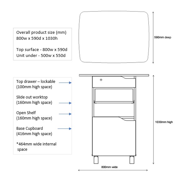 Lockable storage keeps teaching materials secure. A top drawer, slide-out worktop shelf, open shelf, and base cupboard provide 464 mm of internal space across the unit — enough room for lesson plans, laptops, stationery, and personal items. The slide-out shelf doubles as laptop storage during transit.